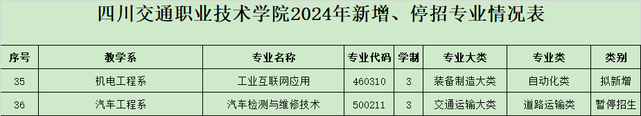 学院现有11个二级教学单位,由9个教学系和公共课教学部、马克思主义学院组成。2024年,开办招生专业36个,其中三年制高等职业教育专科专业30个,五年制一贯制联合办学专业4个,学院各系及专业分布情况如表1所示,当年新增招生专业1个,停招专业1个,如表2所示。