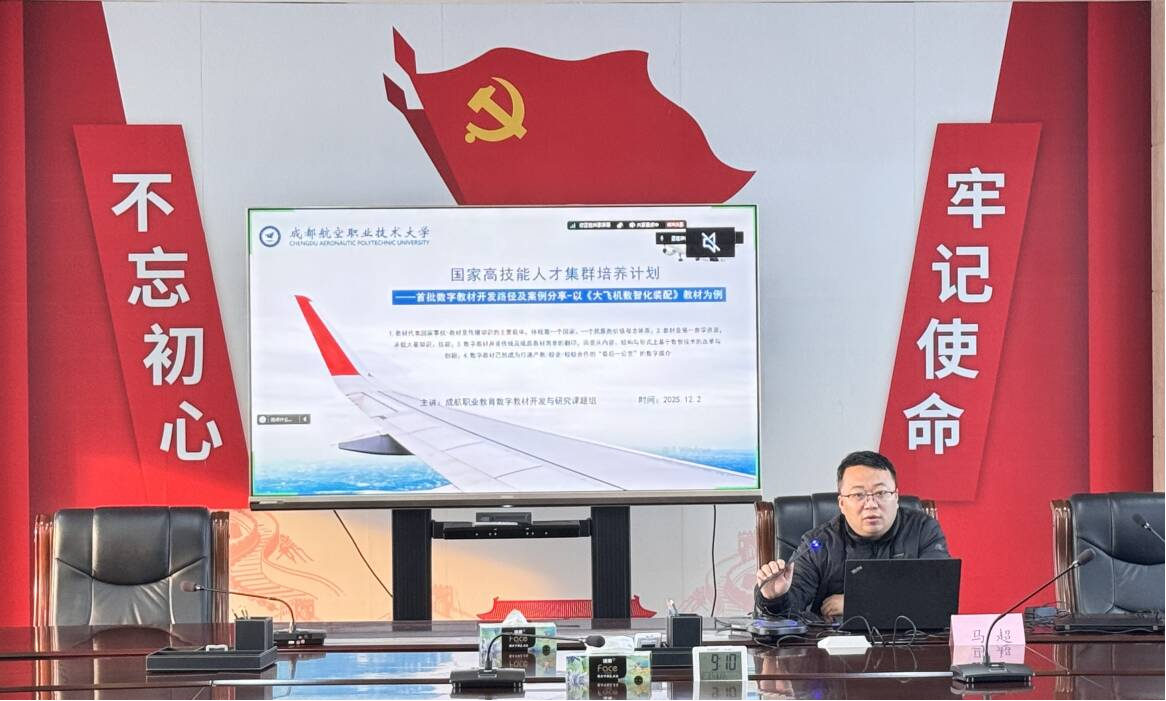 成都航空职业技术大学马超教授围绕“高技能人才集群培养计划”首批数字教材建设经验做分享,详细介绍了《大飞机数智化装配》的开发思路和开发手段,重点展示了使用数智技术手段,创新数字教材学习新方式等,为交通运输类专业数字教材建设提供了可推广可借鉴的实践经验。