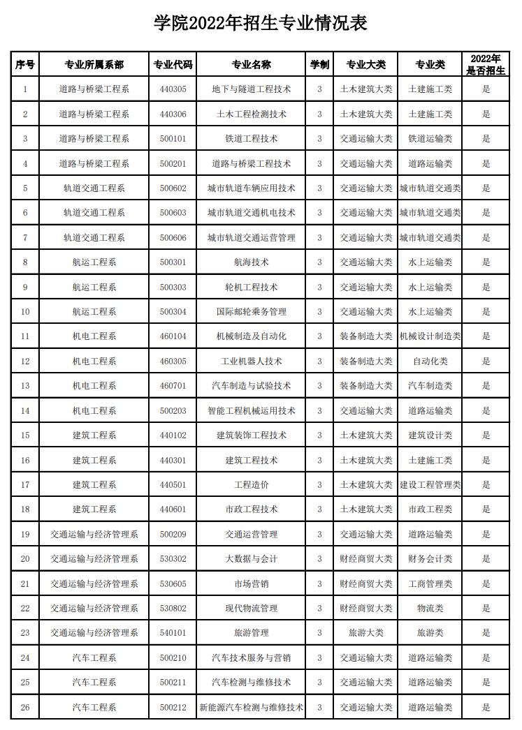 学院现有11个二级教学单位,由9个教学系和公共课教学部、马克思主义学院组成。2022年,开办招生专业42个,其中三年制高等职业教育专科专业36个,五年制专业6个,学院各系及专业分布情况如表1所示,当年新增专业1个,如表2所示。